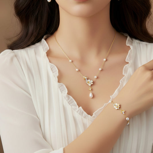 Silver Pearl Elegant Jasmine Flower Jewelry Set - Earrings Necklace Bracelet