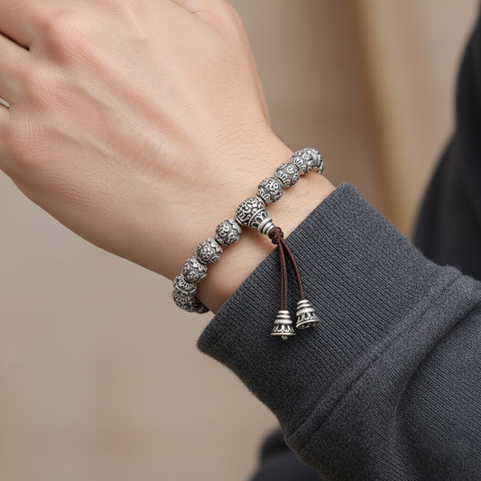 Silver Six Syllable Mantra Men Beaded Bracelet