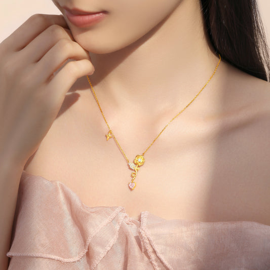 Silver Zircon Yellow Rose Pink Heart Necklace