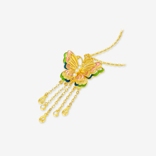 925 Silver Gold Plated Enamel Butterfly Tassel Necklace