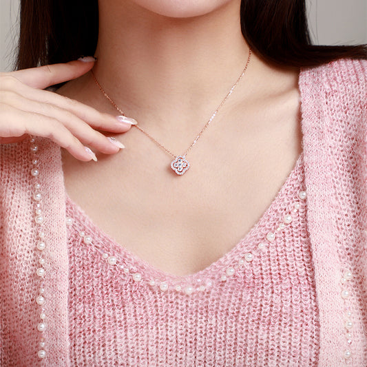 Silver Zircon Double-sided Rotatable Lucky Clover Necklace