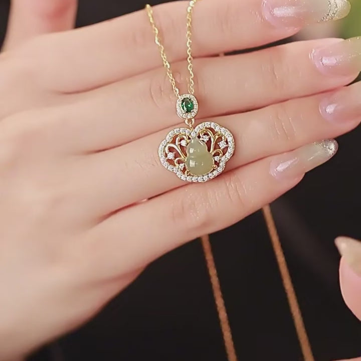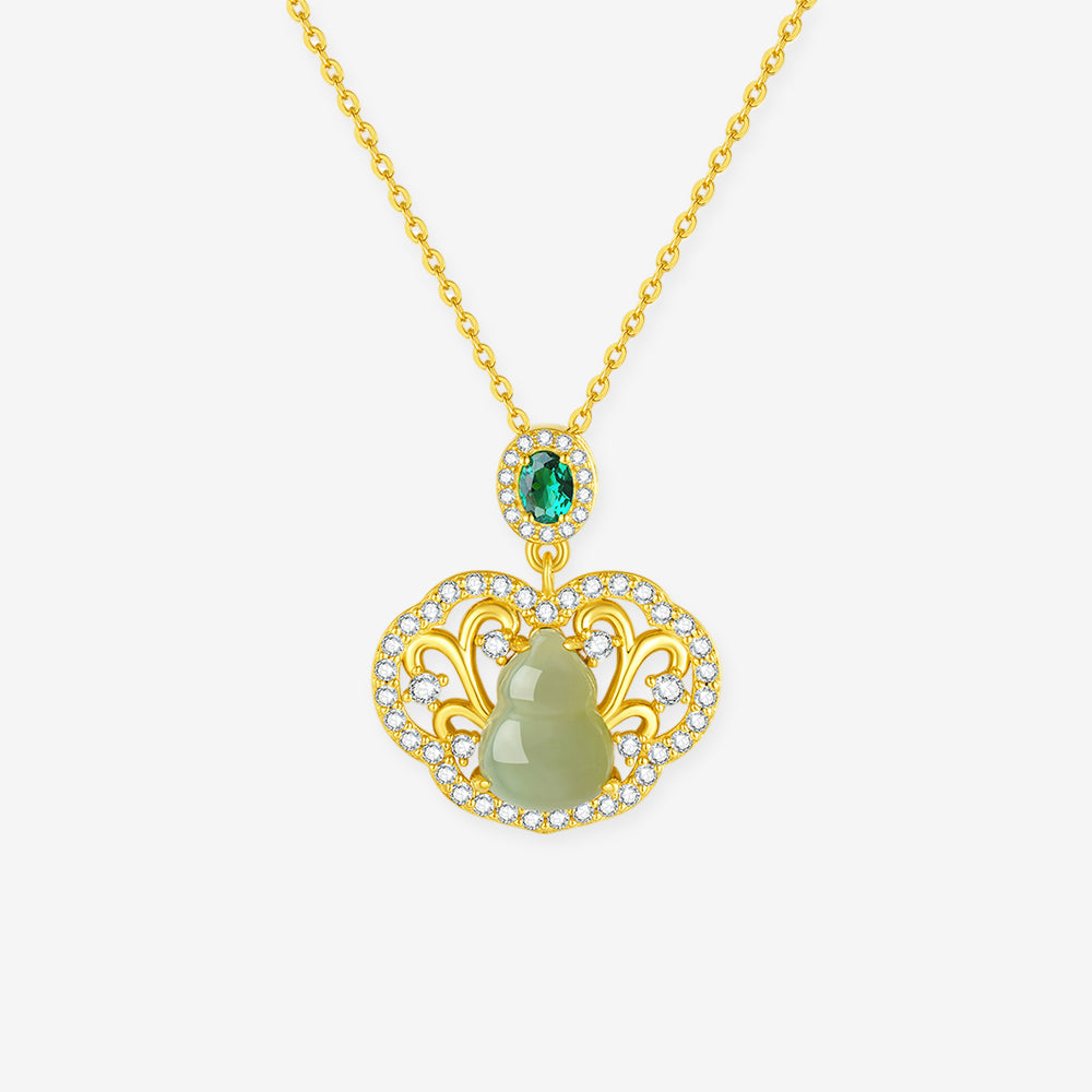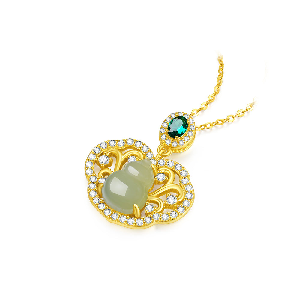 This S925 silver necklace features a gourd and auspicious cloud design, symbolizing good luck and fortune. The perfect gift for auspicious occasions. Handcrafted with Hetian Jade, this necklace exudes luxury and elegance.