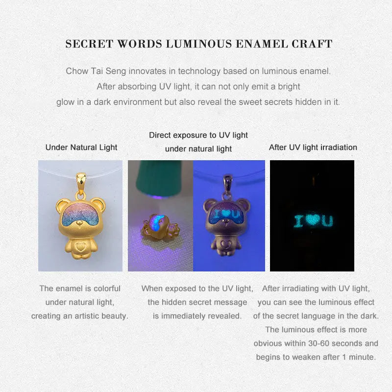 🐻Chow Tai Seng innovates in technology based on luminous enamel. After absorbing UV light, it can not only emit a bright glow in a dark environment but also reveal the sweet secrets hidden in it.