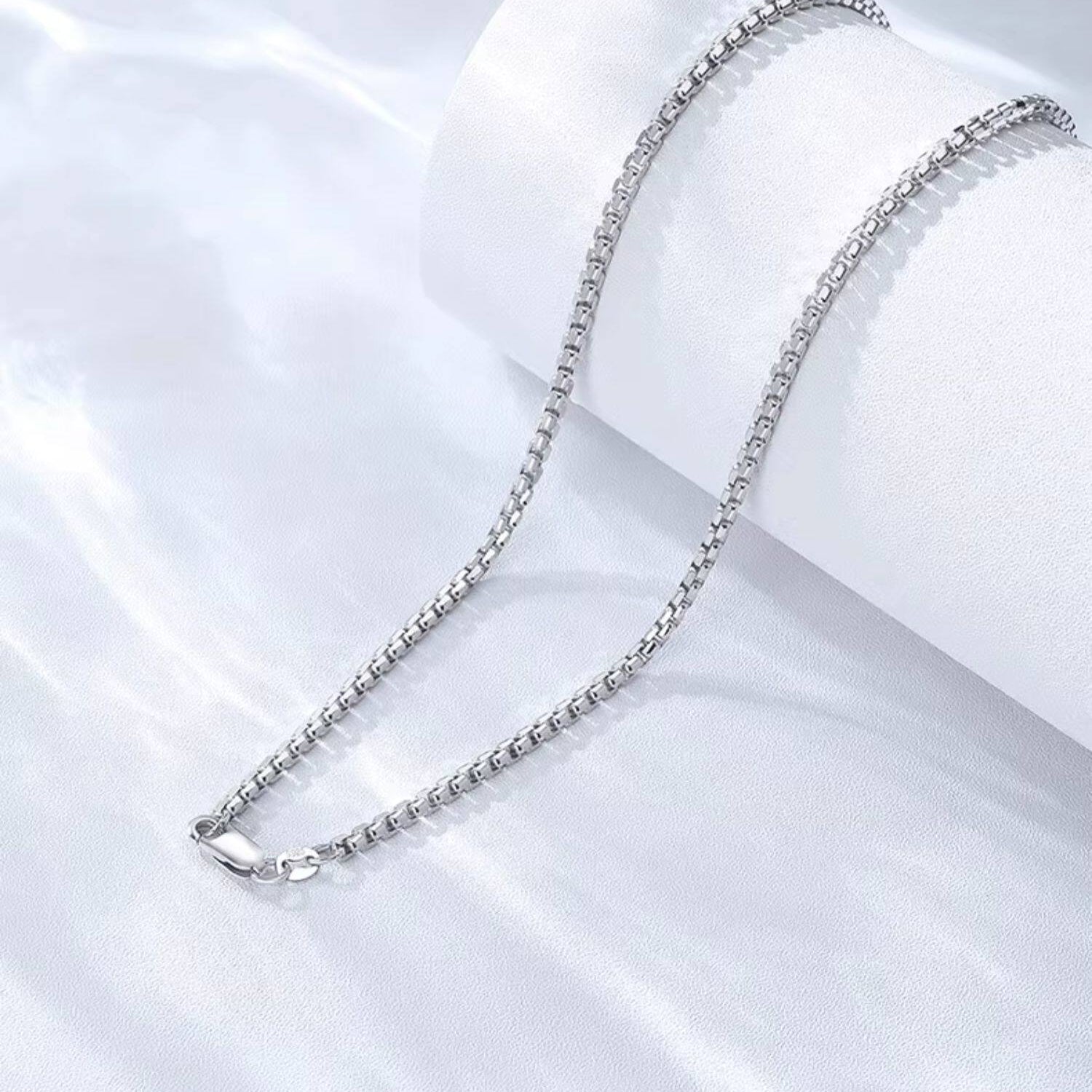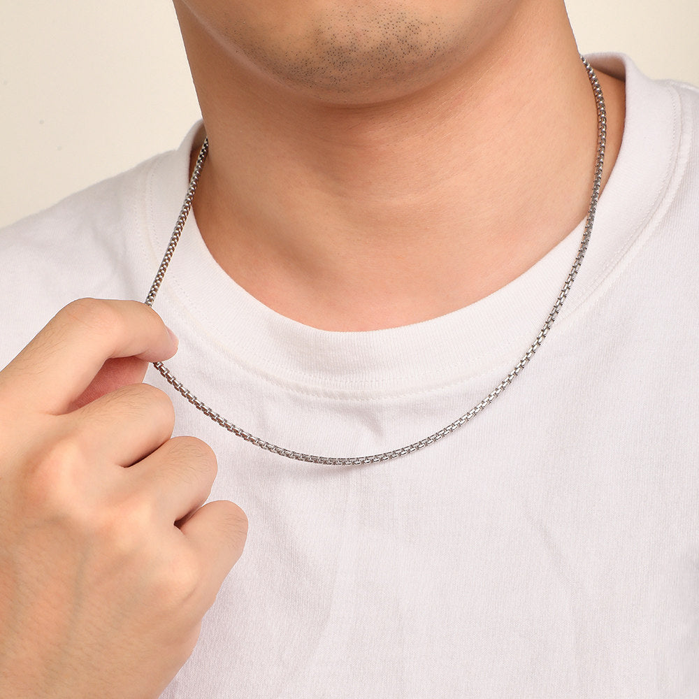 This men's necklace features a classic box chain design with clean, flowing lines, exuding a low-key yet sophisticated charm. Crafted from select silver, it boasts a warm, lustrous sheen and is durable and wear-resistant. Its simple, basic style is versatile and easy to match, suitable for both everyday wear and formal occasions.