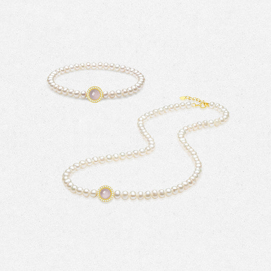 S925 Silver Gold Geometric Buckle Pearl Jewelry Set - Bracelet Necklace