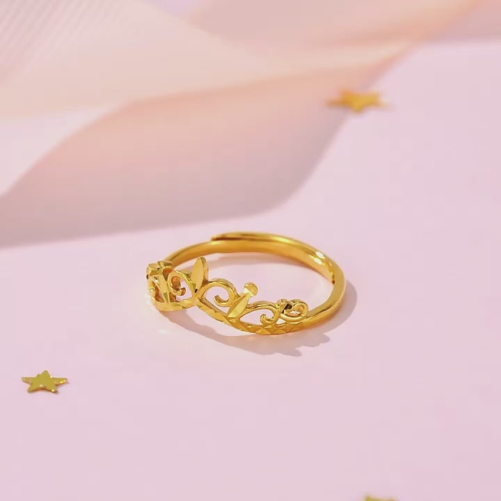 This 24K Gold Princess Crown Ring captures timeless elegance with its refined design. Crafted in radiant 24K gold, the ring delicately mimics a princess's crown, adding a subtle yet enchanting touch to any outfit. Its graceful silhouette exudes sophistication while reflecting a sweet, regal charm perfect for those who appreciate understated luxury.