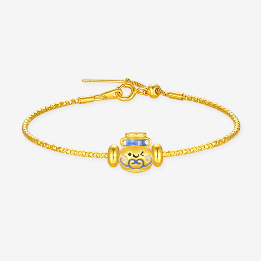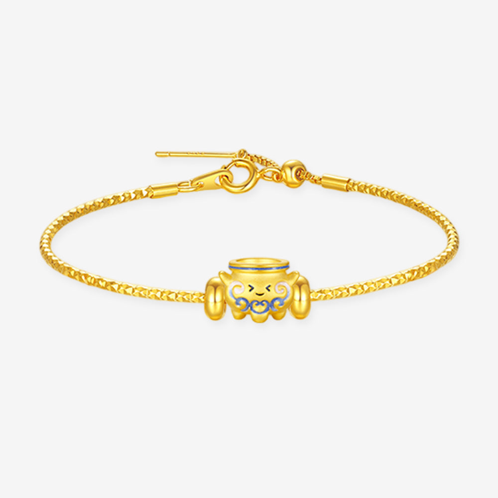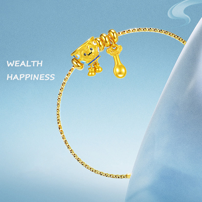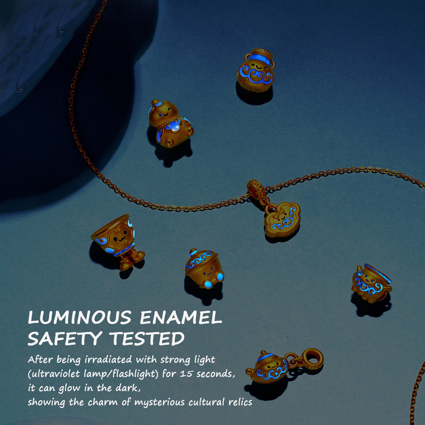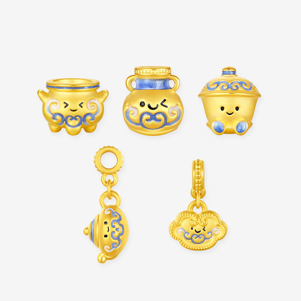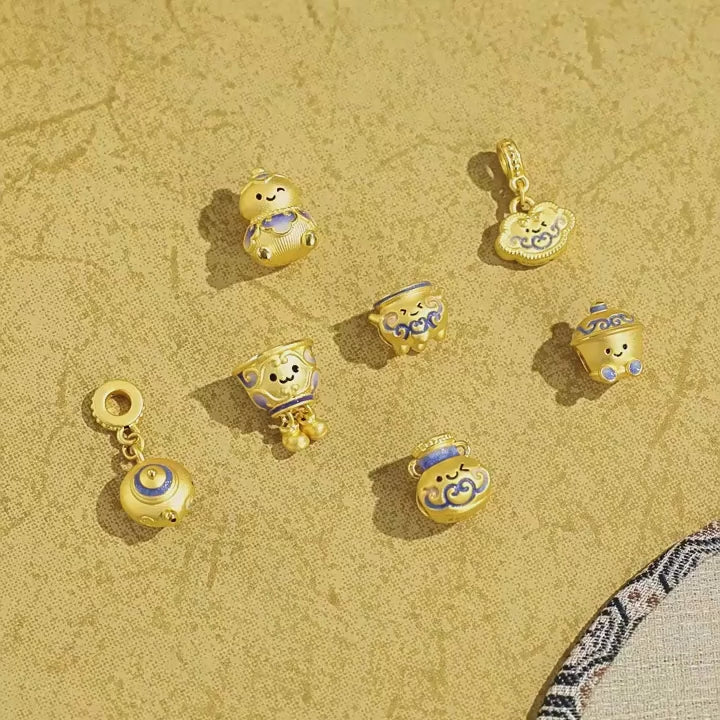 This captivating charm, inspired by Chinese blue and white porcelain, transforms classic ceramic pieces into adorable little sprites. Crafted with meticulous 24K gold and a special enamel coating—which absorbs ultraviolet light and radiates a mysterious glow in the dark—it seems to breathe new life into the ancient porcelain.