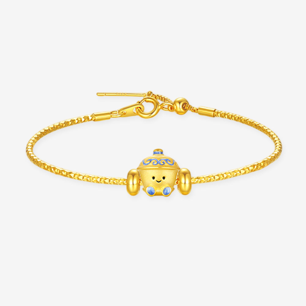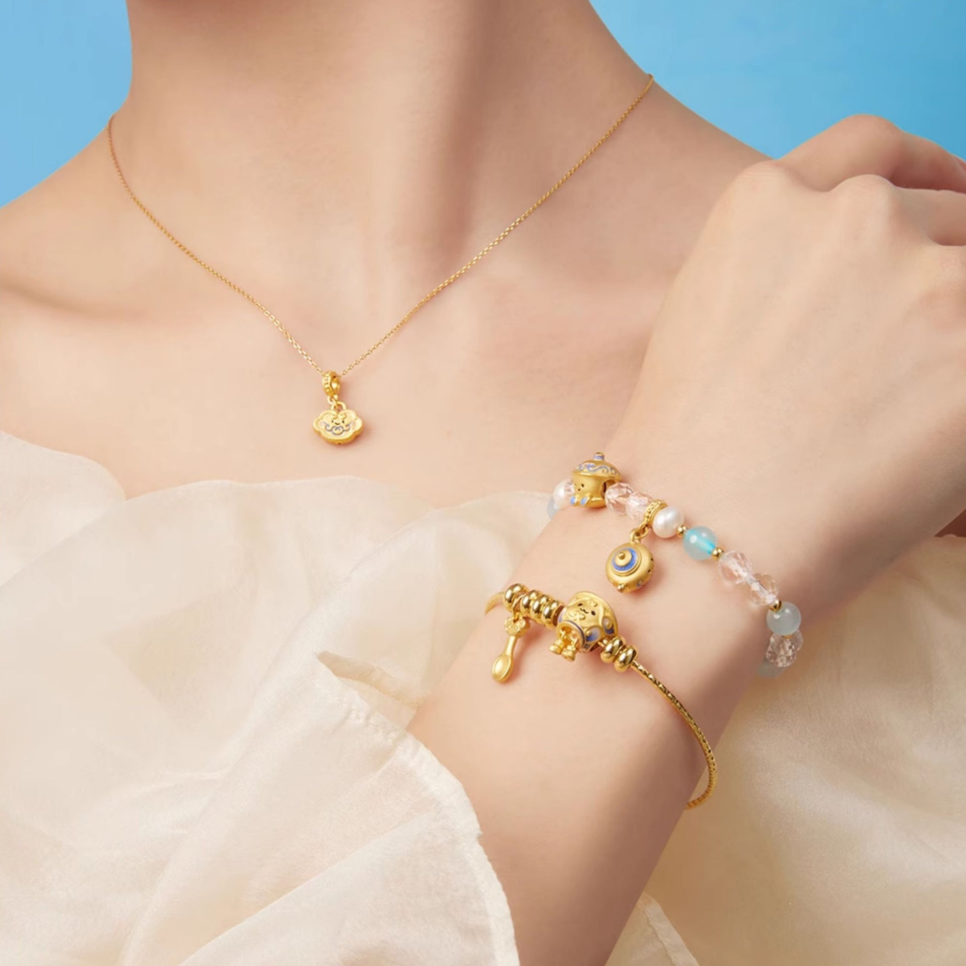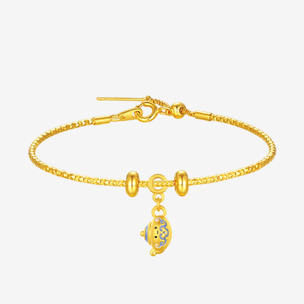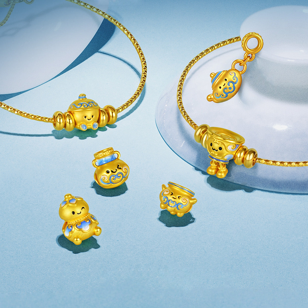 This captivating charm, inspired by Chinese blue and white porcelain, transforms classic ceramic pieces into adorable little sprites. Crafted with meticulous 24K gold and a special enamel coating—which absorbs ultraviolet light and radiates a mysterious glow in the dark—it seems to breathe new life into the ancient porcelain.