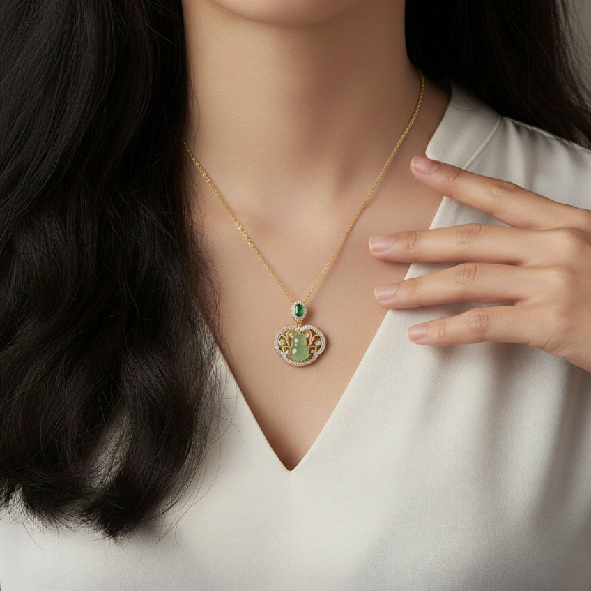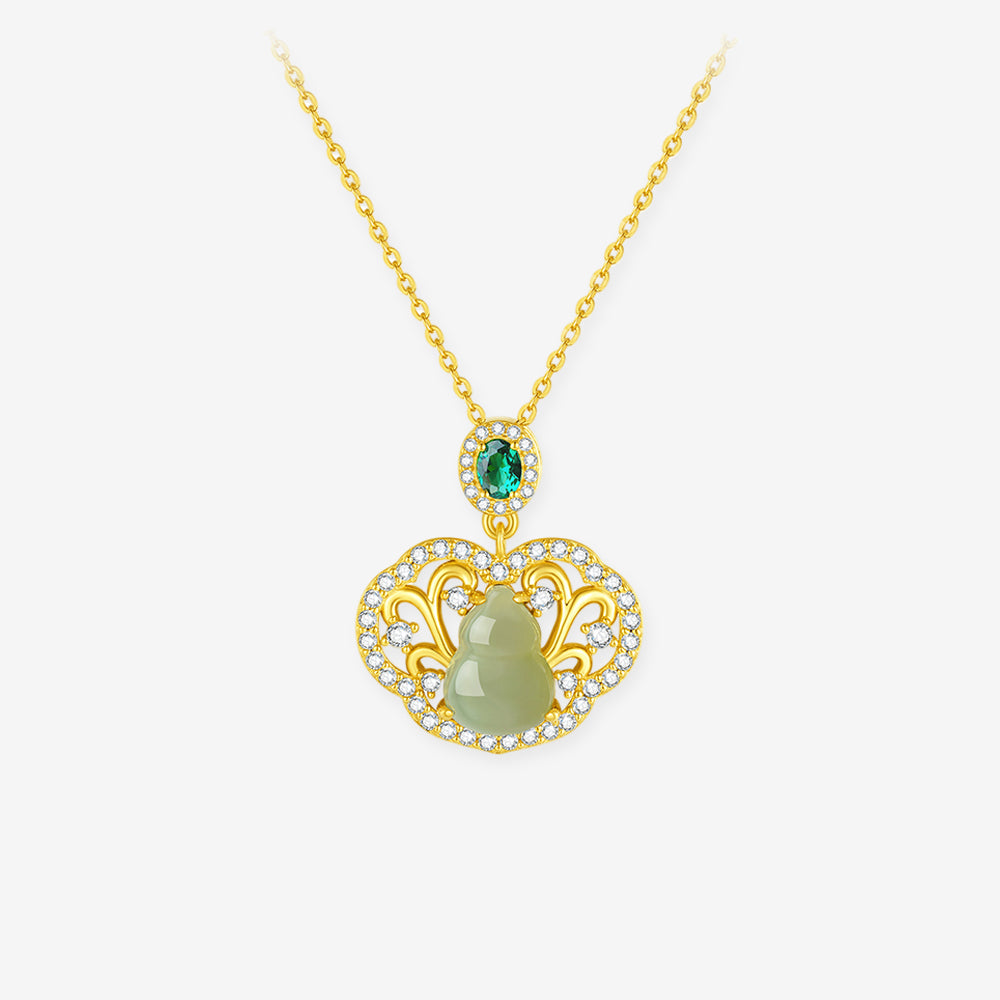 This S925 silver necklace features a gourd and auspicious cloud design, symbolizing good luck and fortune. The perfect gift for auspicious occasions. Handcrafted with Hetian Jade, this necklace exudes luxury and elegance.