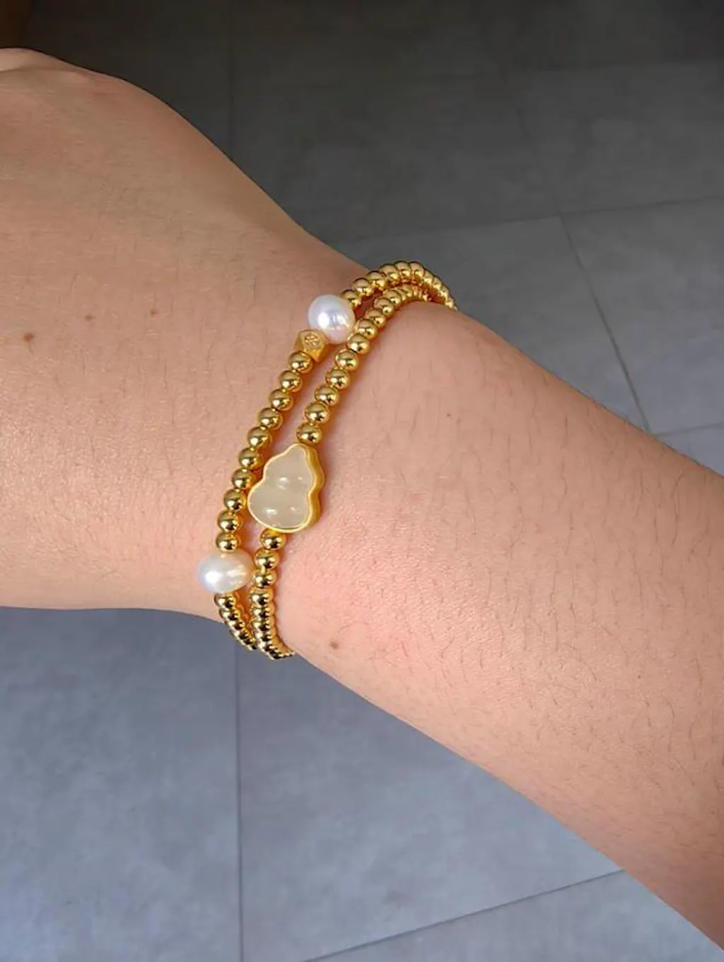 Gold Plated Silver Pearl Hetian Jade Calabash Gourd Layered Bracelet