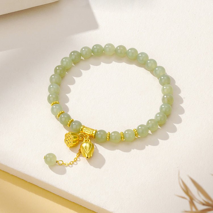 S925 Silver Two Lotus and Pod Green Hetain Jade Beaded Bracelet