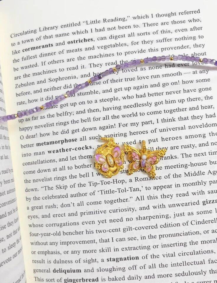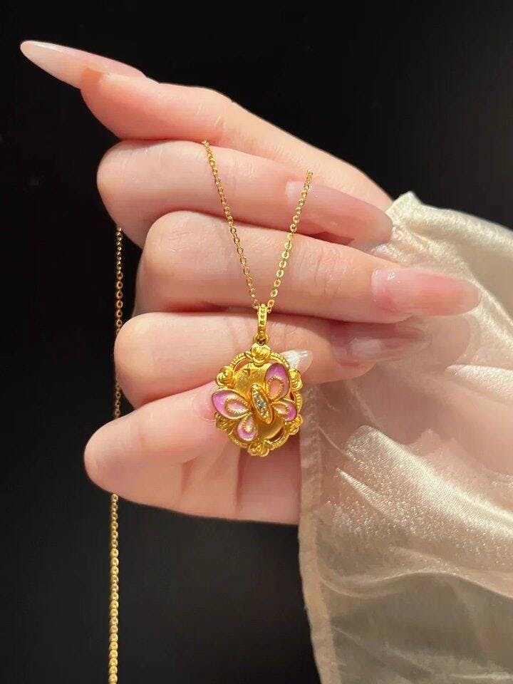 Monet Garden Series 24K Gold Diamond Luminous Enamel Vintage Rose Butterfly Pendant